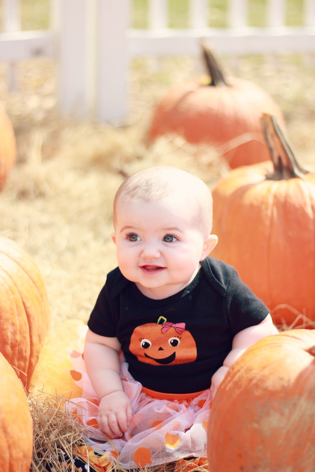 I love fall, I mean really who doesn't? But, Fall in the south is weird. It is not very Fall like. It is hot. The leaves do not change colors or fall and if you aren't paying attention to the door decorations, you may just miss it. Thank goodness for pumpkin patches! Pumpkin patches are like the one stop shop for all your fall festive feeling needs. They bring the fall to the fall less! Pumpkins, cider, hayrides, goats, apple butter, those weird corn stock things, and mums, lots and lots of mums. I was so excited to take Finley to the pumpkin patch. She is only six months old, but I love watching her experience new things, new things like goats and giant orange vegetables, or are pumpkins fruit? gourds?, well whatever. We stuffed/dressed Finley in a pumpkin shirt, Halloween tutu, and matching stripe tights and went to a pumpkin patch in Charleston. It was 100 degrees out and turns out the pumpkin patch was right on the side of a busy road, not quite the fall farm scene I had pictured, but it was sufficient. Most of the attractions were for kids 2+, but that didn’t stop us from waking Finley up from her nap and over enthusiastically parading her around to see the goats, the bunnies, the scarecrows and the PUMPKINS! We will definitely continue this tradition. Here are a few pictures, I wish I could have taken more, but Finley was just learning to sit up, so Brian was close by squatting down in catch-her position and Finley, well Finley was more interested in the eating hay then posing for the camera: